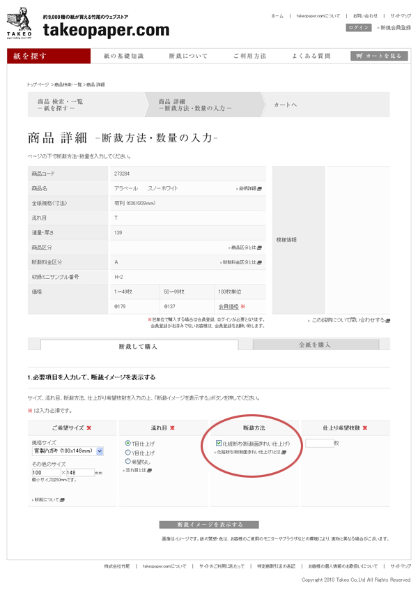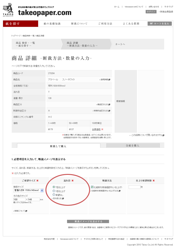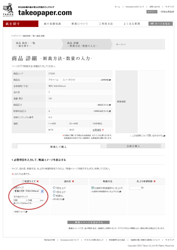 ※この画面での枚数入力欄は全紙購入のためのものです。断裁購入の枚数入力は次の画面で指定してください。