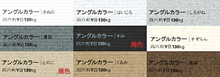 2014.09 一部廃色(すみ、とのこ 四六判Y目90kg・すみ、とのこ、焦茶 四六判Y目130kg)2013.11 一部廃色(くるみ、濃鼠 四六判Y目130kg)
