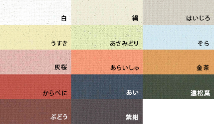 2017.03 一部廃色(うす青、かすみ、きはだ、くるみ、せいじ、とのこ、にぶひわ、ねこやなぎ、ひはだ 四六判Y目100kg|あい、くるみ、せいじ、ねこやなぎ 四六判Y目130kg|あい、くるみ、濃松葉、ねこやなぎ 四六判Y目210kg)2016.11 一部廃色(あさ古染、柿、わさび 四六判Y目100kg|濃松葉 四六判Y目130kg|せいじ 四六判Y目210kg) 2016.08 一部廃色(あざみ、あずき 四六判Y目100・130kg|うす青、柿、金茶、とのこ、にぶひわ、わさび 四六判Y目130kg|かすみ、からべに、はなだ、ぶどう 四六判Y目130・210kg)2013.11 一部廃色(あさ古染、はいじろ 四六判Y目130・210kg|紫紺 四六判Y目130kg|すみ、もも、鼠 四六判Y目100・130kg|はなだ 四六判Y目100kg)2011.05 一部廃色(きはだ 四六判Y目130・210kg|白茶 四六判Y目100・130kg|ひはだ 四六判Y目130kg)