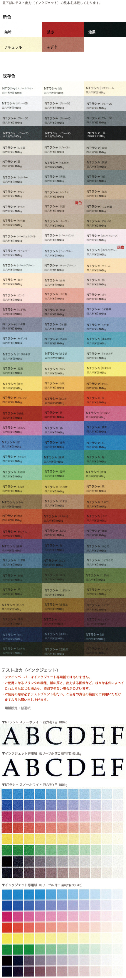 2014.05 2014年7月1日よりリニューアル ・「キクラシャ」「ベルクール」「エキストラブラック」を統合(一部の色、紙質、連量は順次切り替わります)・増色5色(あずき、濃赤、漆黒、ナチュラル、無垢) ・増連量(四六判Y目 70kg、菊判Y目 48.5kg、69.5kg、118kg) 2000.04 増色(四六判Y目 100kg、130kg 青鼠、グレー05、グレー10、グレー20、グレー30、グレー40、グレー50、グレー70、グレー90、濃松葉、シルバー、しろ鼠、ティーグリーン、鉄、ときわ、鉛、ハーブ、パールピンク、緋色、びゃくろく、ベージュホワイト、ペールグリーン、ホワイトブルー、ホワイトローズ、ライトブルー、ライラック、ラベンダー|四六判Y目 170kg、200kg グレー10、グレー70、スノーホワイト、たばこ)