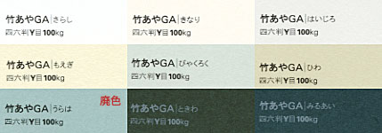 2020.09 一部廃色(うらは 四六判Y目 100kg) 2006.11 一部廃品(四六判Y目 130・170 kg うらは、ときわ、はいじろ、 ひわ、びゃくろく、みるあい、もえぎ)