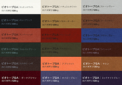 2012.10 増連量(四六判Y目170・210kg)2010.07 増色5色(アプリコット、ダークブラウン、ネイビーブルー、マロン、ミッドナイトブルー 四六判Y目60・90・120kg)