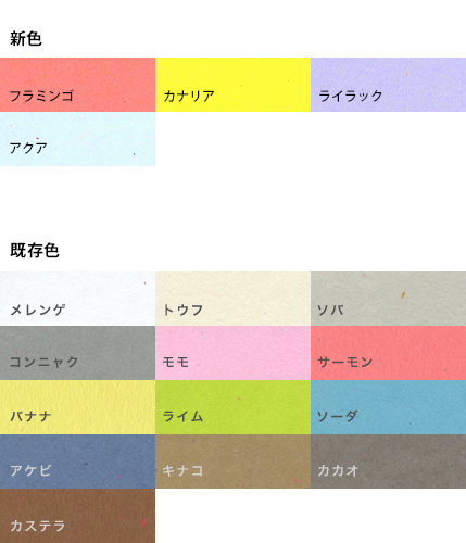 2017.07 増色(カナリア、フラミンゴ、アクア、ライラック 四六判Y目 90kg) 増連量(メレンゲ 四六判Y目 200kg)