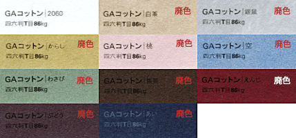 2016.12 一部廃色(あい、えんじ、からし、銀鼠、焦茶、白茶、空、ぶどう、桃、わさび 四六判T目86kg)2009.03 一部廃色(1060(未晒) 四六判T目86kg)