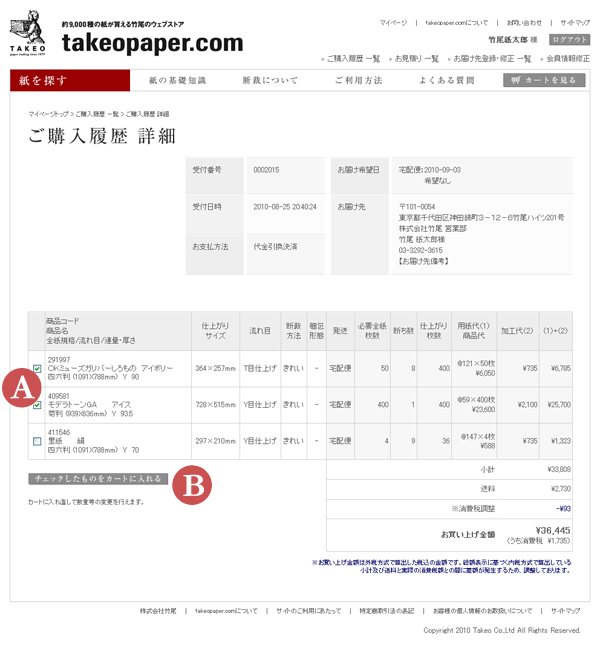 ご購入履歴の詳細からチェックした商品をカートに入れることができます。