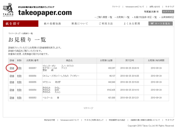 「お見積り 一覧」ページ