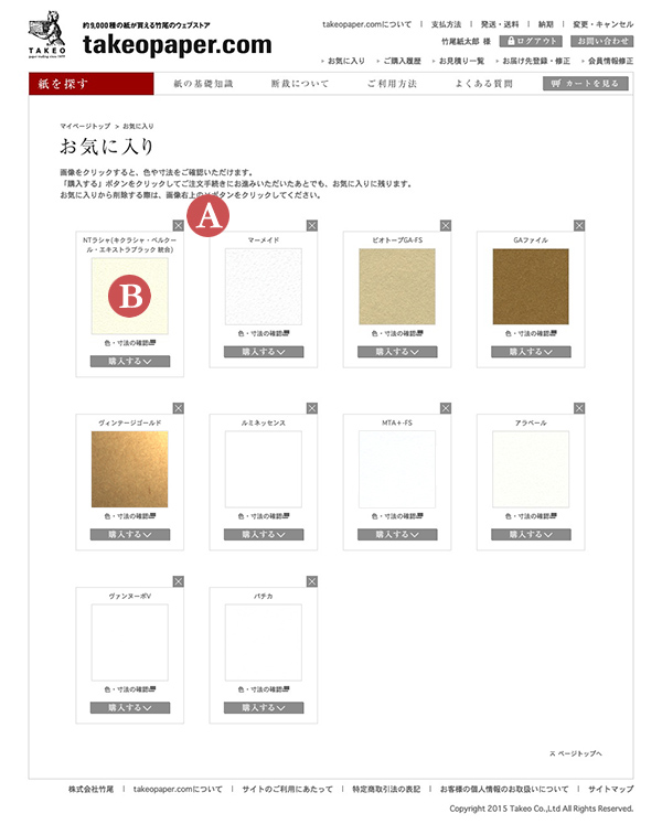 商品検索時に、銘柄や竹尾ミニサンプルなどの商品をお気に入りに登録することができます。