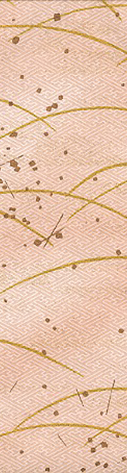 和紙友禅は、古風な有職模様や琳派模様など、高度に様式化された友禅文様を原図としています。 今回は、つゆ芝草と紗綾形の合わさった古典的な柄です。