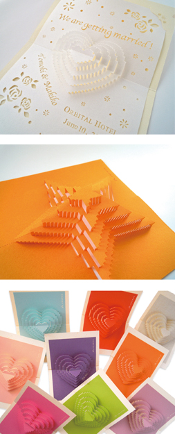 - NTラシャは、豊富なカラーバリエーションとレーザーカットの加工性のよさから選びました。5段のケーキで多いところで12枚の紙が重なります。折り畳んだときにかさ高くならない素直さも大切な選択のポイントでした。クラシックリネン-FSは、ポップアップが映える深みのある色の選択肢があり、絹目の様な質感は特別なカードであることを演出してくれました。(名手宏之さん)