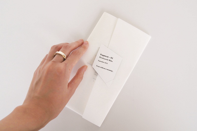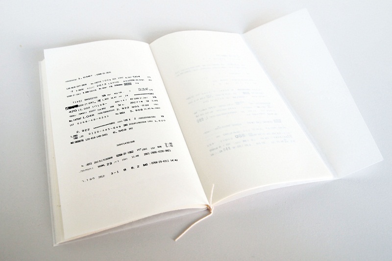 - 「読み解く」という行為への考察。レシートから採取した文字を罫線上に並べたコラージュを制作し、冊子にまとめた。本来あったところから切り離され、再構築された文字列は、にわかにはレシートから採取されたものとは気づかれにくい。パターンとして認識している。読者はなにかのきっかけで、その文字列が日付や金額、品番などを示しているということに気づいたとたんに、目の前のパターンは意味を持ったテキストに変化する。