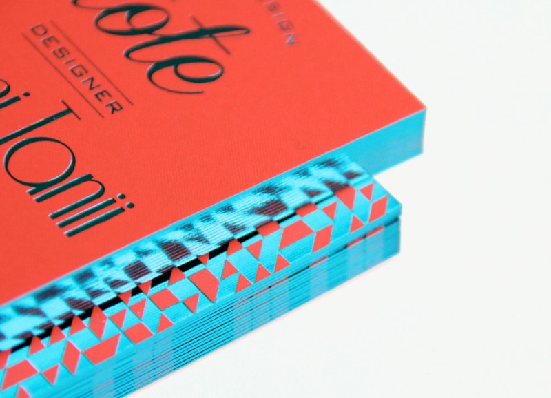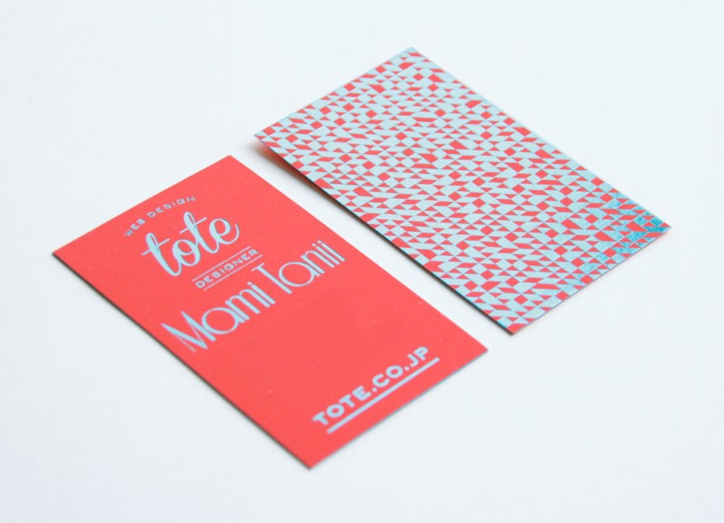 - 生地感のある表面の微細なエンボス、鮮やかな蛍光色という特徴をもつリアクション-FSのシグナルレッドを、発売当初から名刺に使いたいと考えていました。スカイブルーメタリックでの箔押しとの組み合わせで、ビビッドトーンの補色をぶつけた存在感のある名刺を目指しました。(tote 谷井さん)