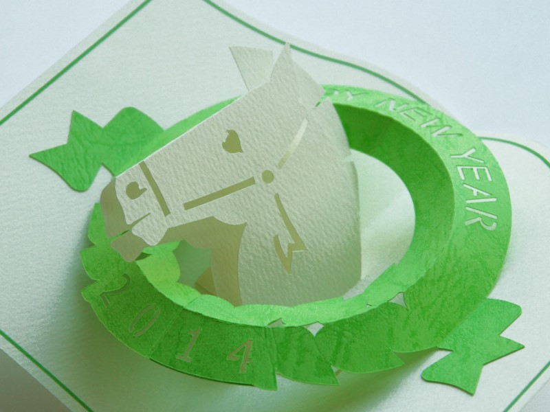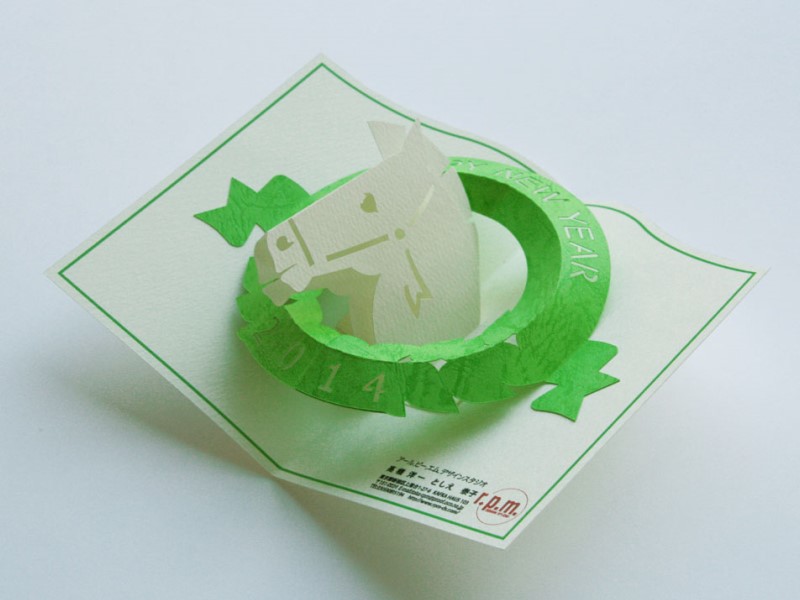 - 二つ折りのカードを開くと、干支が起き上がり、リース状のリングが立体になるPOP-UP 式の年賀状。一度開くとリング部分がストッパーとなって台紙が閉じないようになります。