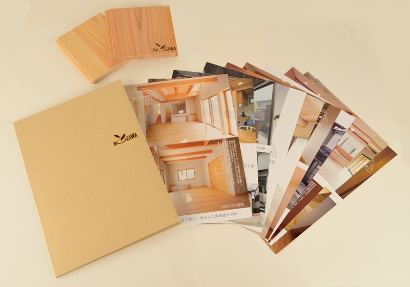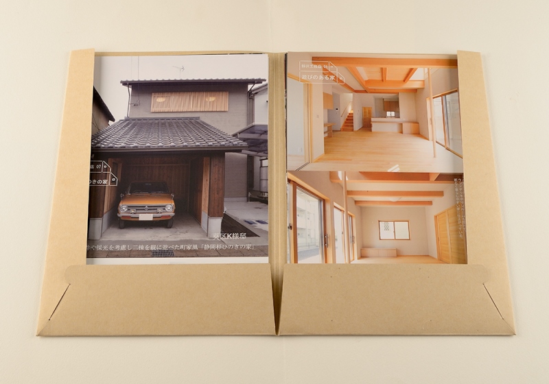 - 施工例のA4の資料の為のファイルの制作にあたり、自社の自然素材へのこだわりを伝える為に、できるだけ温かな質感で少し重厚感のある紙をと考えていたのでこの紙に決めました。色も木の色に近いオークにし、表紙も自社のロゴを焼き印で押すだけのシンプルな物にしました。素朴な感じがとても気に入っています。(有限会社野沢工務店さん)
