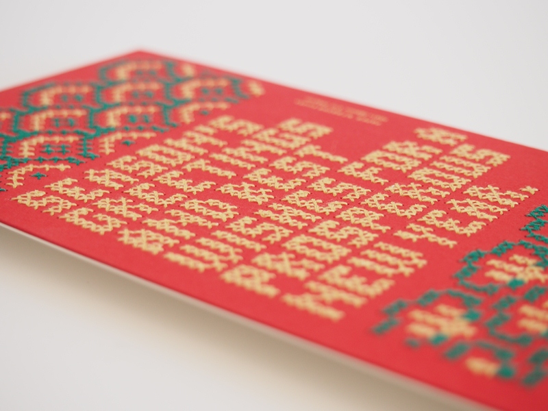 - 1949年の誕生以来、日本のファインペーパーのパイオニアとして長く愛され続け、いまやファインペーパーのスタンダードとして定着しているNTラシャが2014年7月リニューアルいたしました。新色の無垢、漆黒、濃赤を含む5色を使用し、実際にクロスステッチのような刺繍を施しました。紙の緻密で温かい肌触りと刺繍を併せた、クリスマスに相応しいカードに仕上がりました。(株式会社竹尾 企画部)