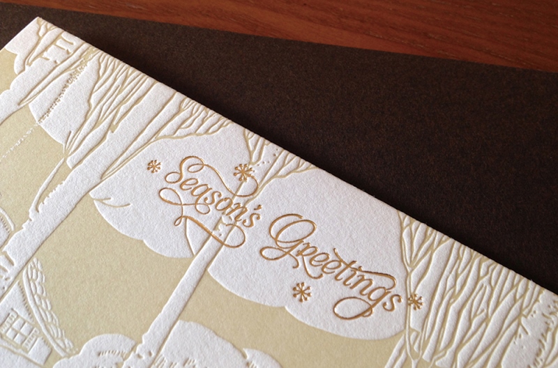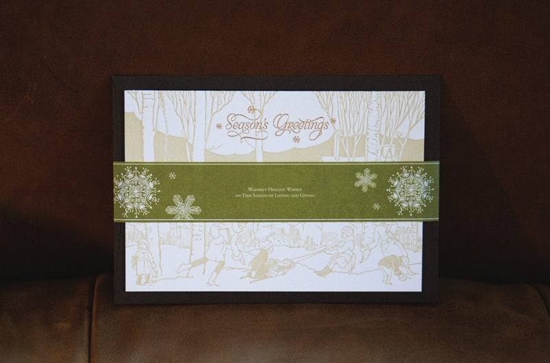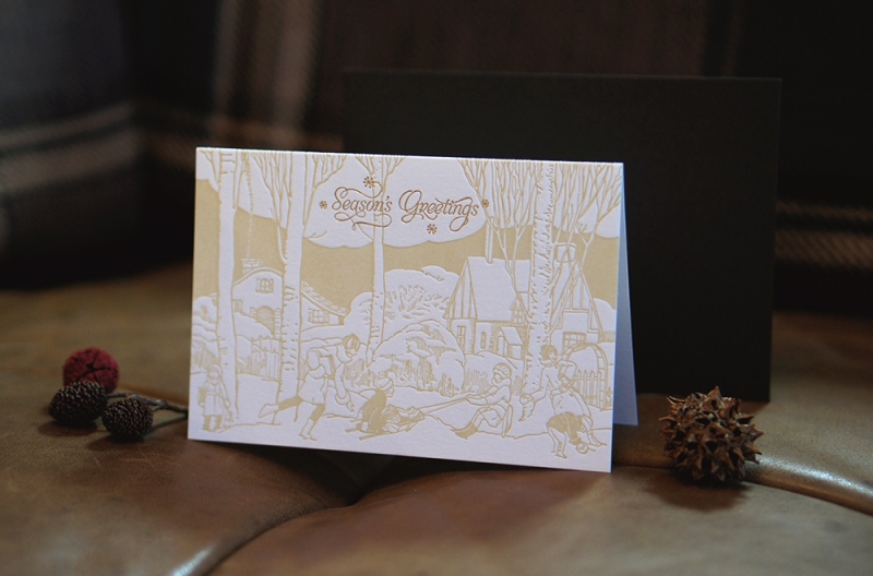 - 雪の中、子供達が元気に遊ぶ景色を描いたグリーティングカード。温かみを持たせ、ふわふわとした雪の質感を表現したく、優しくソフトな手触り感のあるコットン紙を使用しました。また、コットン紙の中でも、ペン等で書き味の良いグムンドコットンを選びました。(HOZZ DESIGN 保泉 泉さん)