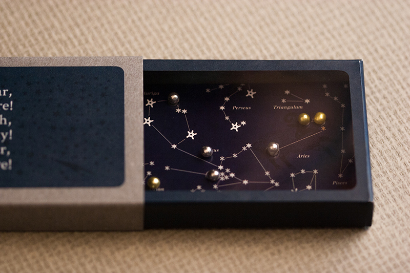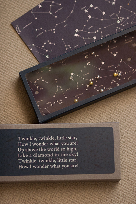 - 2015年の干支である羊から連想し、牡羊座を含む星座表を表した穴入れゲームを制作いたしました。牡羊座には金星を、それ以外の星(一等星)には銀星を入れて完成です。箱の上には透明な何かで覆わねばならず、そこで透明なアリンダが厚さ・丈夫さ共に適しており、使用いたしました。(BACCOさん)