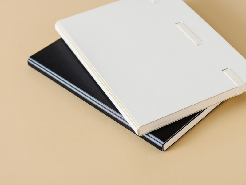 表紙の表面は気包紙の風合いと肌触り、色の深み(黒)が良く、使用しました。表紙の層の部分は紙のミルフィーユの特徴であるの断面を活かすため色数の多いタントから厳選して使用しました。本文は書き心地にこだわり、バンクペーパーを選びました。また、袋の中身が透ける具合も良く、使用しました。(三洋紙業株式会社さん)
