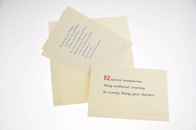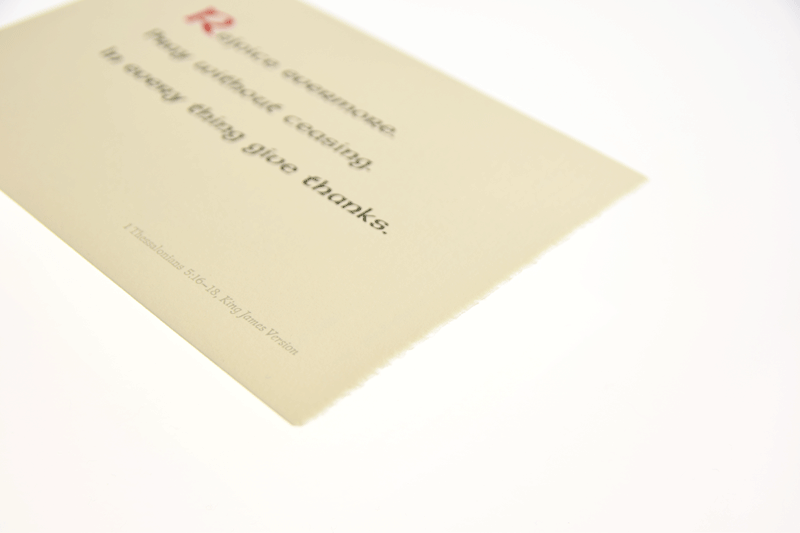 聖句を活版印刷しますので、紙も格調高いものを使いたいと考えました。活版でロベールに印刷できることは、最も安心感のある組み合わせと認識していましたが、さらに3枚のカードの内英語の聖句を耳付にしたい、というアイディアが生まれ、ロベールの二方耳付に決定しました。なかなかこのような作品は簡単には作れませんので、封筒も妥協無く、ロベールでオーダーしました。(美篶堂 上島さん)