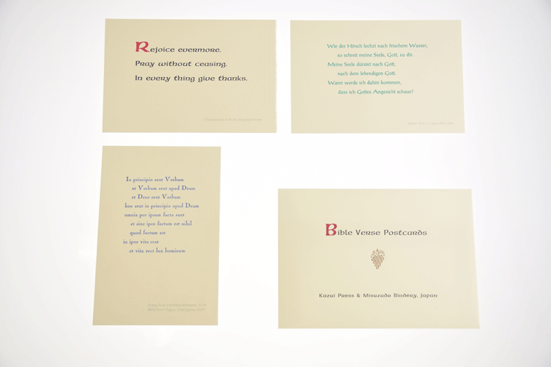 - 嘉瑞工房の貴重な金属活字コレクションから、髙岡昌生による、デザインと組版で、英語、ドイツ語、ラテン語3種の聖句を印刷しました。