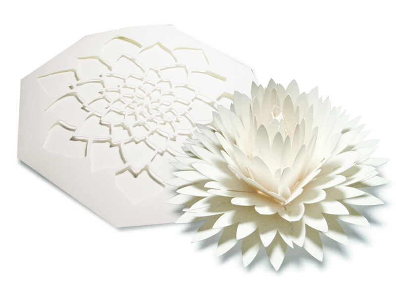 - 接着剤等は使用せず、約40個の紙のパーツを組み合わせてダリアの花を表現しています。ポップアップで花びらがスムーズに開く構造、強度から検証し、アラベールを使用しました。 (PAPER & ARTS 三好 祐一さん)