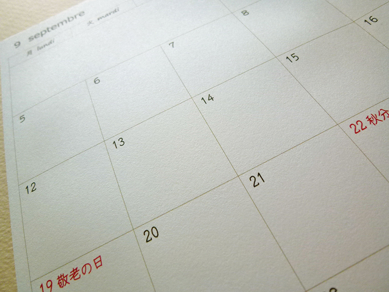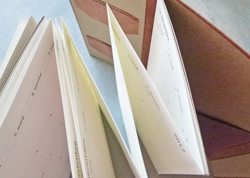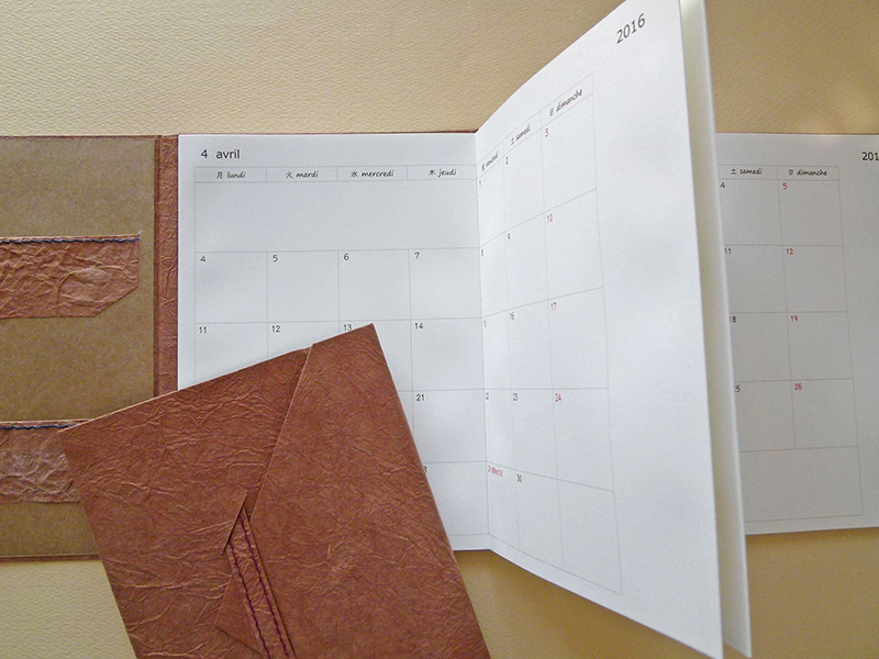 表紙は自分で漉いた国産楮100%の和紙を柿渋で染め、シワ加工をして革製品風に、中のカレンダー部分は蛇腹に仕上げ、広げて数カ月分を見られるようにしています。(アトリエここるぴあ 佐治直子さま)