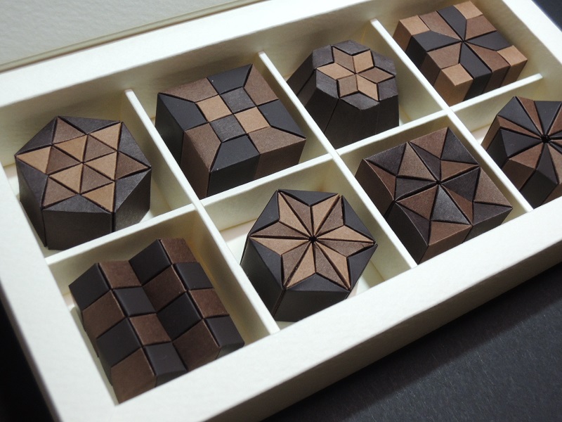 特種東海製紙が主催する”ペーパーアート”のコンペティション「第25回紙わざ大賞」にて竹尾賞を受賞した寺門晃代さんに、受賞作品と同じコンセプトで制作したペーパークラフト作品「寄せ木のショコラ(詰め合わせ)」をご紹介いただきました。