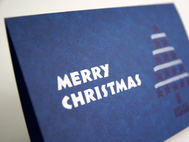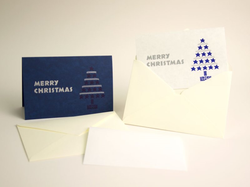 - 青と銀のインクを用いて活版印刷を施した、二つ折りのクリスマスカード