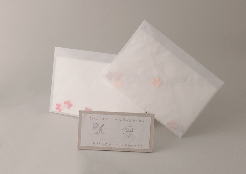 - 封筒に入れるための紙のはなびらは、相手や気持ちによって色々な紙を選べたらいいなと思いました。マーメイドは色合いが淡くて優しい雰囲気が好きで使いました。袋に使ったクロマティコのフロスティグレイスは中に入っているものをきれいに透かしてくれるのが気に入っていて選びました。(竹尾社員)