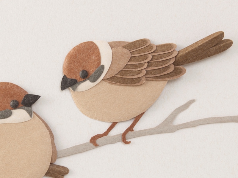 - 里紙のナチュラルな色が本物の鳥の色目に近く、又、繊維の見える和紙のような風合いが、鳥のやわらかい羽根の表現に適していました。ビビッドな色目には、タント、NTラシャを使用しました。細かな羽根の切り込みもきれいにカット出来、特にタントはカールを美しく保ちます。