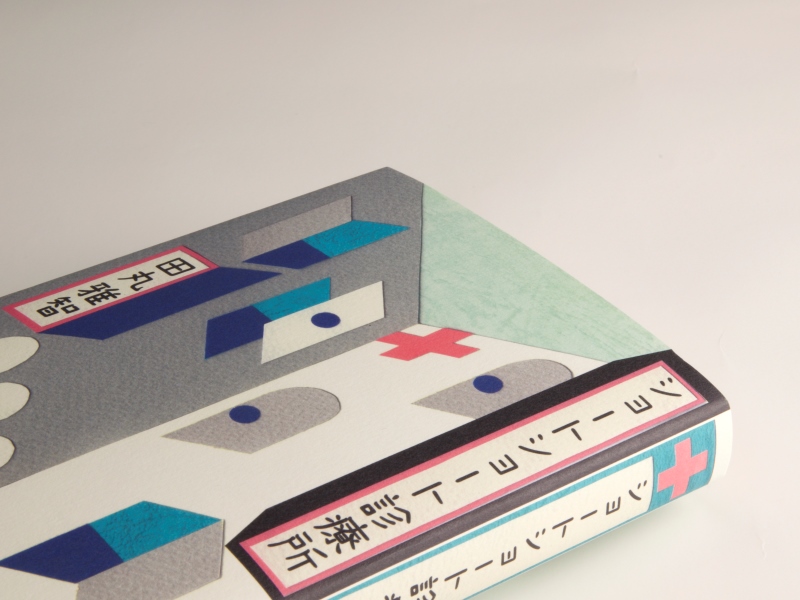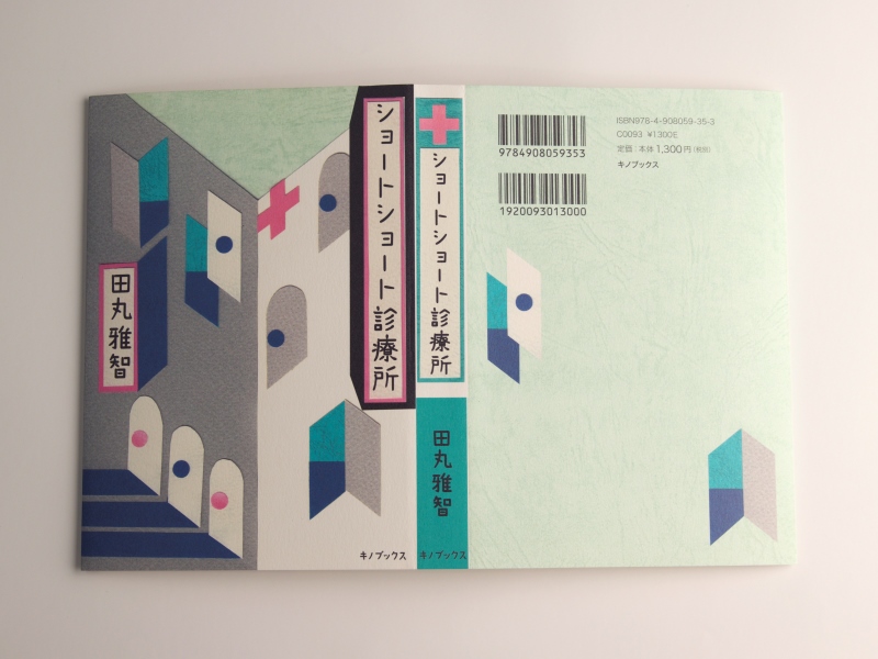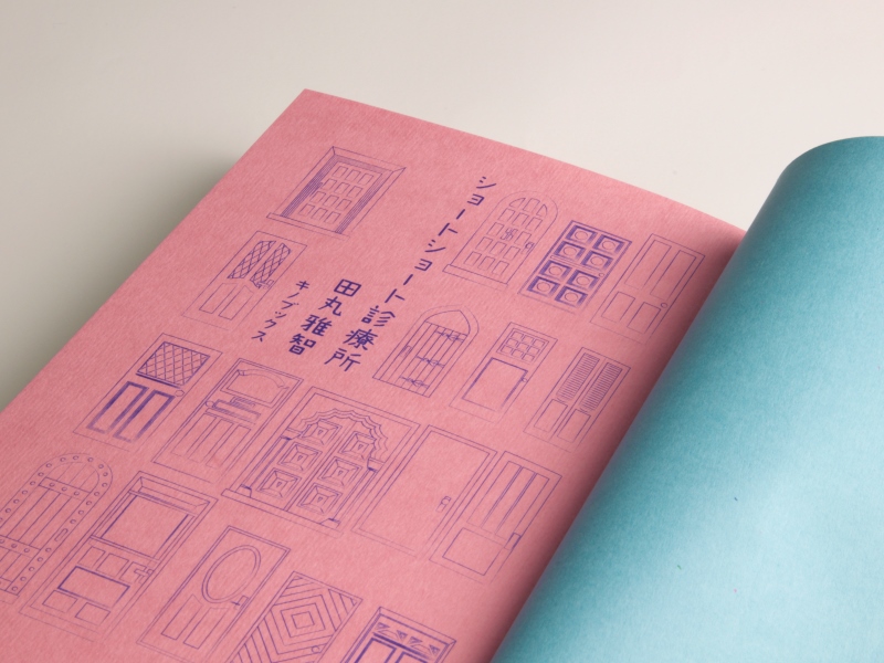 まず、カバーですが、紙の絵の原画にはレザックやマーメイドなど、風合いがあるので、それを印刷で再現するには、素直なアラベールが手触りも視覚的にもぴったりと思いました。ちょっと現実離れしているような時間を超えた感じを出してたくて、ホワイトを選びました。表紙のタントは、キノブックスさんの本すべて統一なのですが、紙の絵の水色といい響きを作っています。見返しでポルカレイドのソーダの明るい水色、そこから今回の診察所のシンボルカラーでもあるピンクに引き込むため、別丁扉はモフルのローズにして遊び心を演出しています。ピンクは甘くなるかな、と心配したのですが、編集者さんから「女性が手に取りやすいように、多少甘めでもいいと思います」との言葉をいただき、思い切ってローズを選びました。小さめで手に収まりやすいサイズ、そして少し文芸書っぽさから外れたような、いい感じが出たのではないかなと思っています。(田中千絵さん)