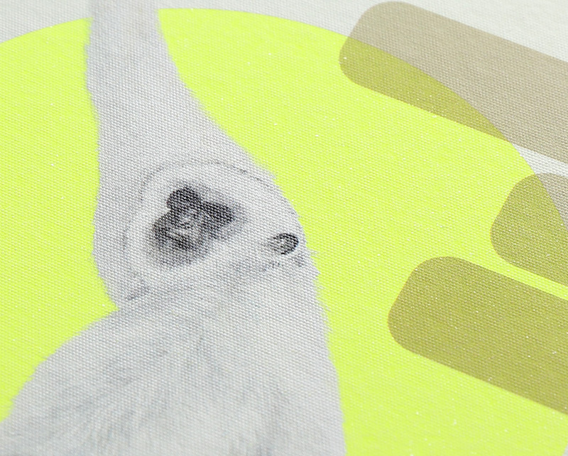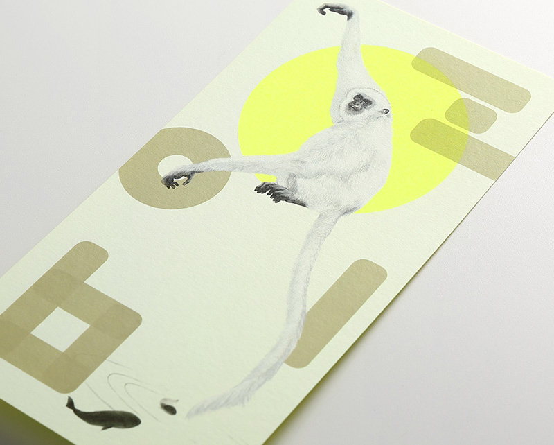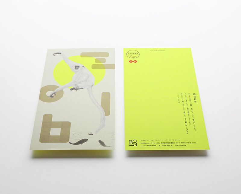 - 目の眩むような蛍光イエローの「リアクション-FS」に干支の申を日本画風にあしらった、アンバランスさが楽しい年賀状となりました。UV白インクを幾重にも重ね、丸窓に切り抜いて地色を見せることで、鮮やかな紙の魅力を引きだしています。猿の周辺に浮かぶ金色の雲は、「2016」また社名の「BOEL」とも、どちらとも取れるようなバランスで作成しています。(株式会社BOEL 中野さん)