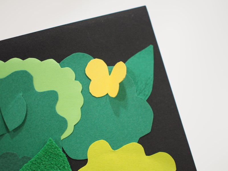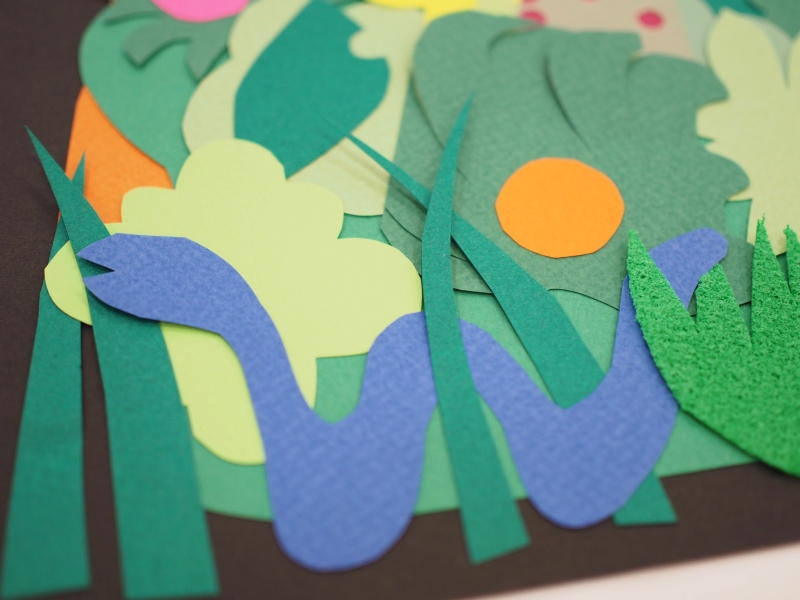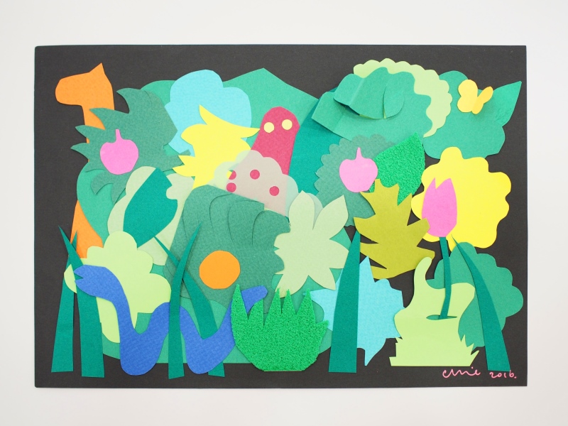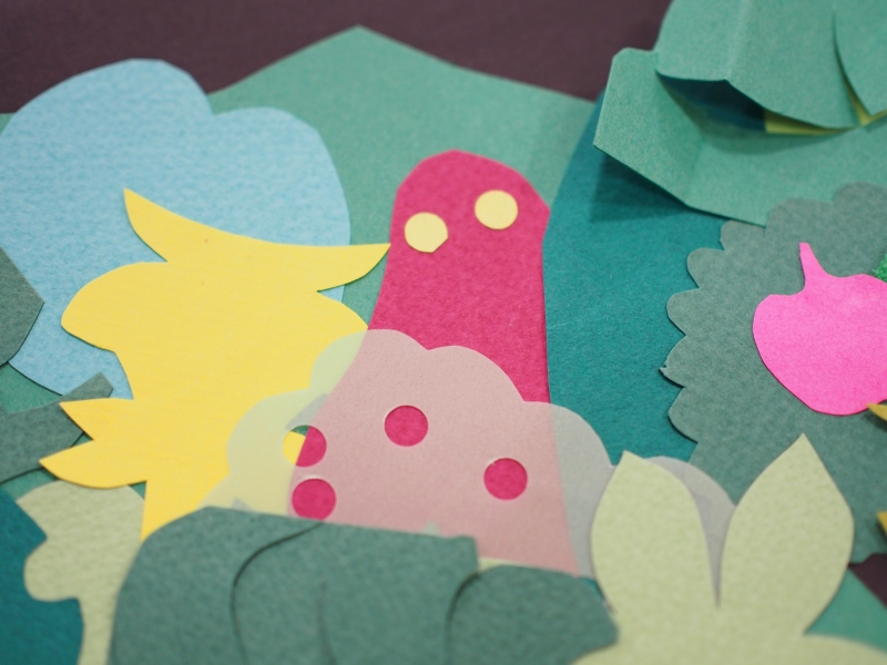 ファンタジーの森を表現するのに、たくさんの色々な緑色を選びました。ワークショプを想定して、子供達が手触りや硬さ、ハサミの進み方を感じられるように、質感や厚みの違うものも取り入れながら選びました。森に住む動物たちや木の実、花、お化けなどは、明るいビビッドな色の紙を使いました。相性の良い色ばかりを始めにチョイスしたので、ランダムに組み合わさってもとても綺麗な響きを放つ、大型の作品となりました。初めはすべて平らに重ねて平面だった紙がこれだけの存在感を放つ作品になったのには、子供達も大人達も驚きでした。(田中千絵さん)