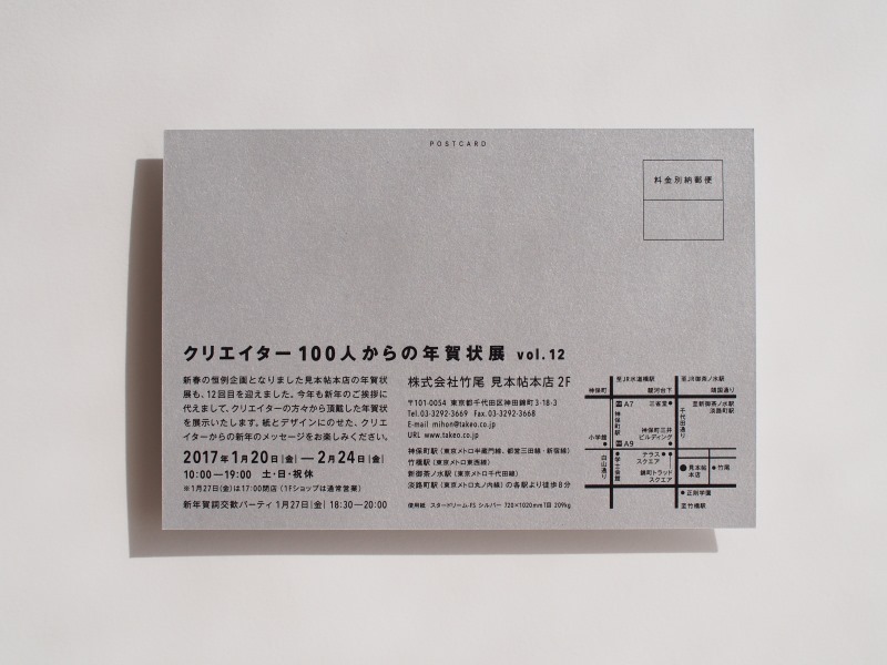 今回「年賀状展」の印刷を考えた時に、「品良くお祝いムード」を出そうと思い、この紙に決めました。一部に金の箔押し加工をすることにより、よりお祝いムードを出すことが出来たと思います。(新村則人さん)