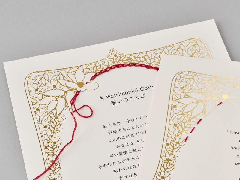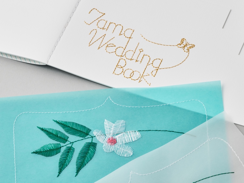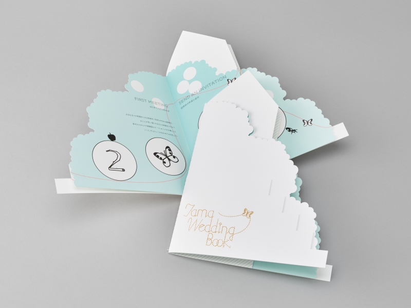 Tama Wedding Boxが、楽しく結婚式を作り上げるコミュニケーションツールになったらいいなと思って、デザインしました。トレーシングペーパーへの刺繍、金色に輝く箔押しなど、結婚式の喜びを感じていただけるように細部にもこだわっています。結婚式までに必要なことが確認でき、写真を貼れば二人だけのアルバムになるブックには、snow(雪)、noble(気品のある)という意味を持つ紙「スノーブル-FS」 を使用しました。森や教会をイメージさせるシルエットです。紙ならではの楽しさで、決まった枠にこだわらず、自由にいろいろアレンジして使っていただければと思います。(田中千絵さん)