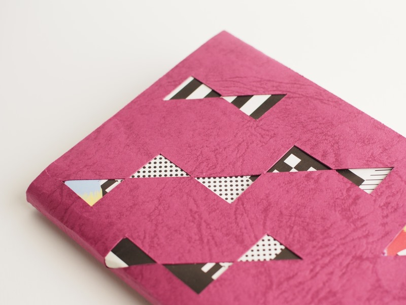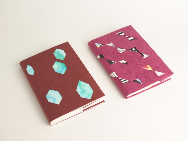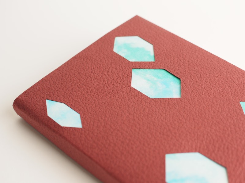 カバーにできそうな強度があれば、いろいろな紙で楽しめるのですが、今回は、着せ替えのチラシや紙の柄が引き立つ深い色、存在感、耐久性のある、しっかりとした紙質という観点から、皮革感際立つレザックシリーズの2種を選びました。「特別な1冊」という”貫禄”がいいですね。ちなみに、レザック16と彩雲 あじさいを使ったカバーは、鉱石をイメージしています。