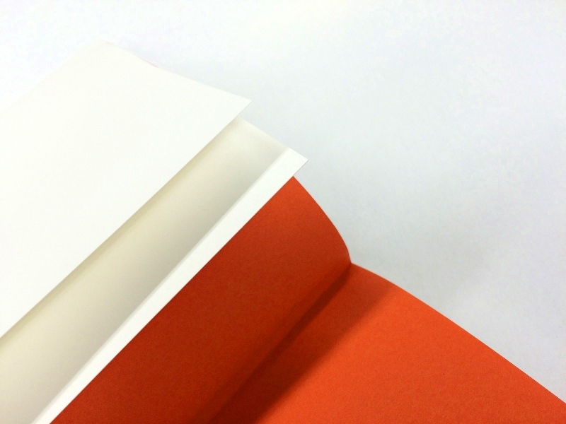 原書にカバーはついていないのですが、日本の出版流通では汚れ防止のためのカバーが必要です。表紙とカバーは同じ紙で揃えたかったので、斤量のバリエーションがあるMTA+ -FSを選びました。表紙にはやや厚めの斤量、カバーにはそれよりも薄い斤量を使用しました。表面には保護用のマットニスをひいています。見返しには、本文で使われている特色インキに近い色ということで、NTラシャの朱をセレクト。原書の見返しと近い色にしたかったので、色のバリエーションが豊富なNTラシャを選びました。