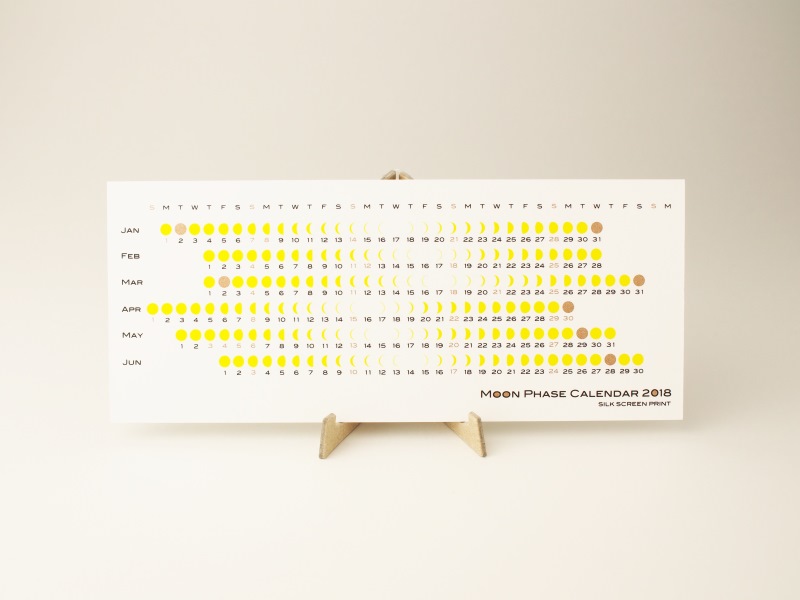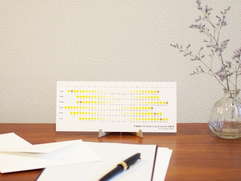 - 月の満ち欠けカレンダーの用紙を選定するにあたり、シルクスクリーン印刷の特性を活かせる用紙を探しました。ポスター調の2種類は、インキの乗り具合・色の発色・風合いを考え、印刷実績のあるヴァンヌーボV スノーホワイトに決めました。卓上カレンダーにつきましては、厚紙の1枚物で両面に同じクオリティーで印刷ができ、用紙の白さ、風合いがヴァンヌーボに近い物で探しているうちに スノーブル-FSにたどり着きました。実際、印刷をしてみて黄色のグロス感・メタリックゴールドの発色等満足のいく仕上がりになり、おかげさまで購入いただいたお客様にも好評を得ています。