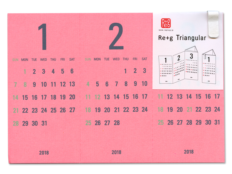 - 「リプラグ トライアングラー」は、三角に巻くことで常に3ヶ月分の日付を確認できるカレンダーです。くるくる回すだけで、3ヶ月間を一度にチェックできるコンパクトな形状。月ごとにミシン目が入っているので、過ぎた月は順に切り取ることができます。