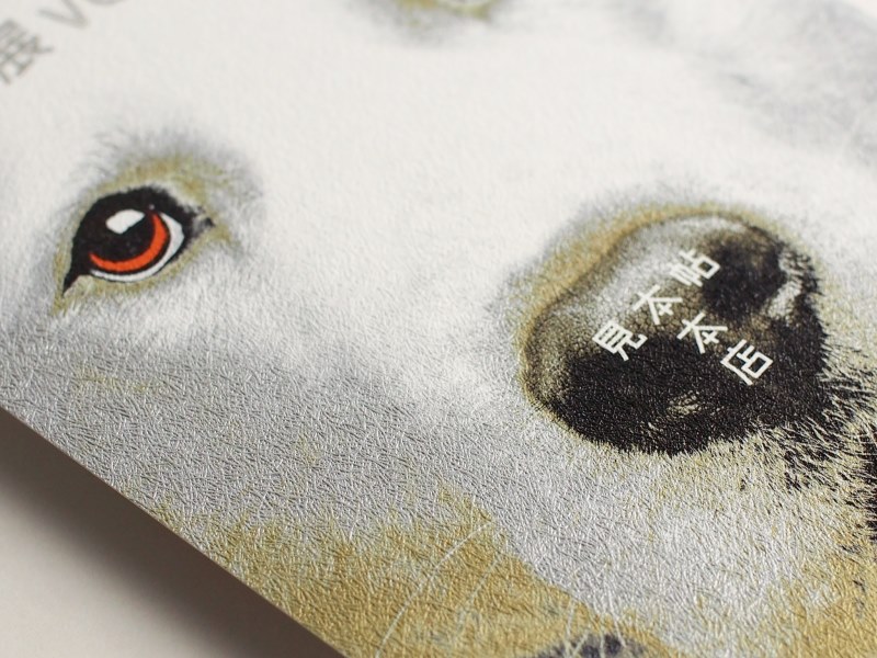 デザインは、古平正義氏にお願いしました。絵柄面は、スミと特色のシルバー、ゴールド、オレンジによるオフセット印刷で、一番明るい部分はプラチナホワイトの紙色が活かされています。また、い織りの有機的な線の重なりのエンボスが犬の毛並みを強調し、立体感のある仕上がりになりました。(株式会社竹尾 企画部)