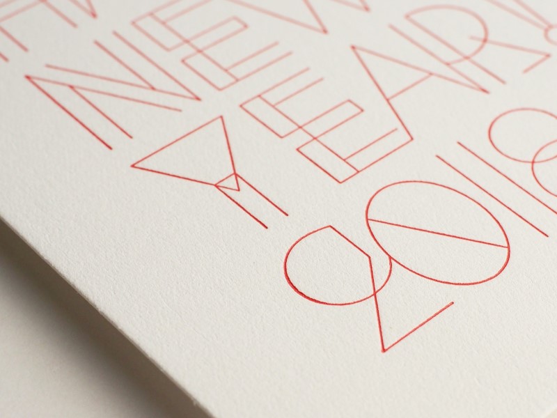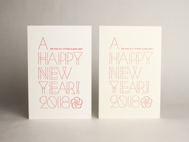 - 新しい年のご挨拶としてシンプルなものをと考え、白い紙に赤インクが映えるものを検討しました。また、細い線が多いデザインのため、活版で特徴を出すためには紙の柔らかさも必要でした。白色度が高く、厚みと柔らかさの両方を兼ね備えていることから、今回パチカを選びました。パチカは本来加熱によって出る透明感が特徴的な紙ですが、触った時の暖かみも年賀状の挨拶に適していると思いました。