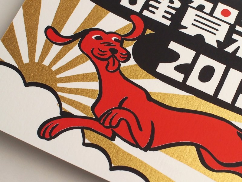 松井美藝堂の年賀状はイラストレーターのKads MIIDAさんによるもので、シルクスクリーンで印刷するために毎年描き下ろしていただいている作品です。今回のイラストも、シルク印刷による金のグロス感と黒・赤のマット感がヴァンヌーボのおかげで対照的に表現できました。(松井美藝堂 松井さん)