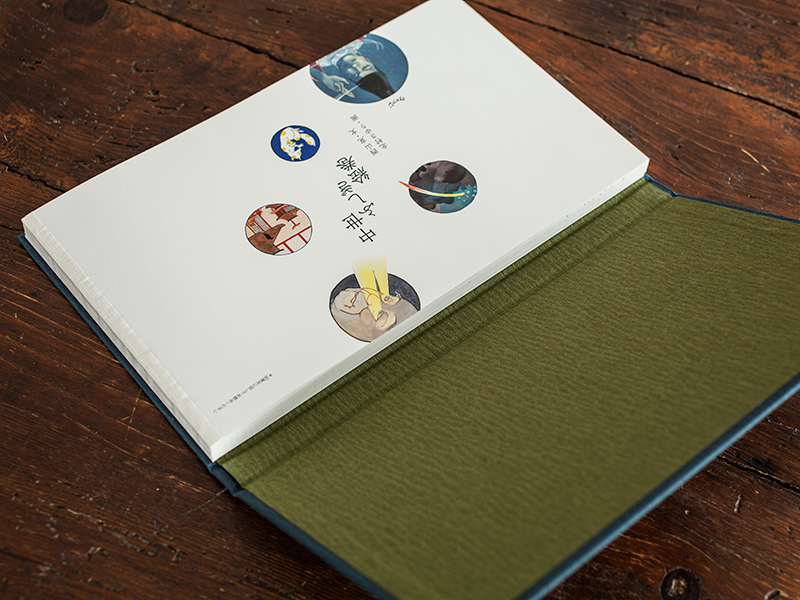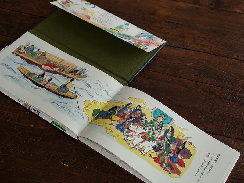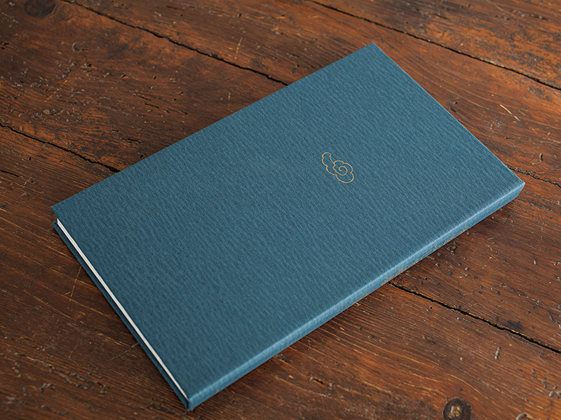 本書は、本文を保護する役目の表紙を特殊な製本で本文とつなげ、和装本のようなデザインとしました。このデザインを考えるにあたって、和装本を保護する「帙」にはしばしば「檀紙」が使われていたのを思い出しました。帙は現在では高級な仕様ですが、チリ付きの上製本でもその味わいが出せるのではと確信し、新だん紙を使用しました。縦長の表紙を90度回転させ、絵巻のように横長にして読む本書は、表紙を開けるしぐさがまるで帙を開帳しているような気持ちにさせてくれないでしょうか?(岡本デザイン室 岡本洋平さん)