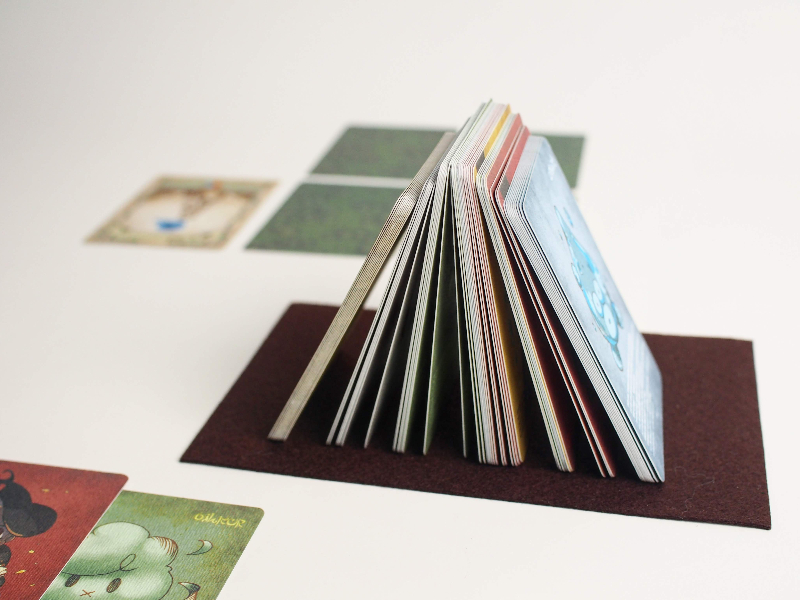 砂山に棒を刺し崩してゆく誰もが知っているゲームをカードゲームとして昇華するためには両面に浮き出るエンボスによって生まれるサーブルの摩擦がなければ成立させることができませんでした。数多くを試作してようやくベストマッチの紙を見つける事が出来ました。