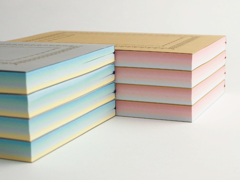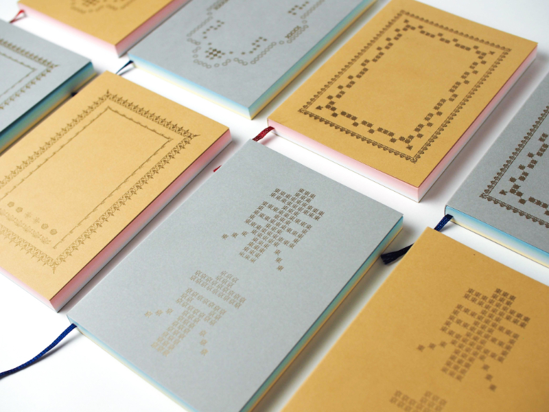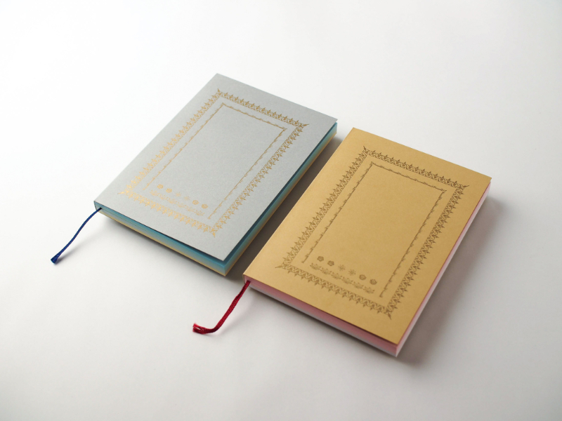 - 活版TOKYO2018にて、活版印刷をご体験いただくワークショップを行うにあたり、活版印刷の歴史ある雰囲気に合う美篶堂手製本ソフトカバーノートの表紙に、活字の装飾枠を活版印刷することをご提案いたしました。活字の装飾枠を施したノートは、さくら色や空色のグラデーションも相まって、古い文庫本のようであり、また日本の伝統的な雰囲気が感じられる印象深いノートに仕上がります。より文庫本の雰囲気に近づけられるように、活版TOKYOの特注で「スピン」を付けてもらっています。是非活版TOKYOにてワークショプをご体験いただけるとうれしいです。(活版TOKYO運営事務局)