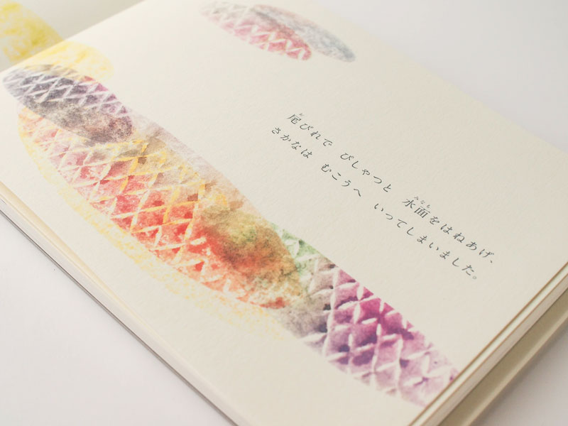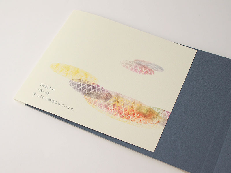 - 頁をめくる感触も物語への入り口と考え、肌触りの良さを一番に、アラベールを選びました。沙羅さんが和紙に木版刷りした風合いをそのままスキャニングしているため、印刷されると不思議な印象になりました。この本の製本は二つ折りの折り山を背固めし、小口に糊で貼る方法で作っているため、ふんわりしているアラベールが製本上でも良い効果を発揮してくれます。(美篶堂/本づくり協会 上島明子さん)