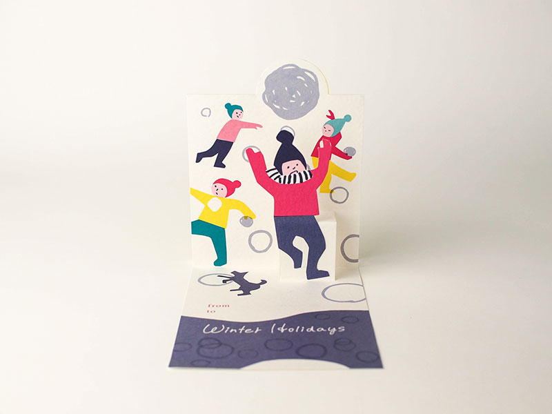 - 毎年1つ新作を加えつつ、しかけのあるグリーティングカードを制作しています。今年は雪景色を表現したくて「ハンマートーンGA スノーホワイト」を選びました。表面のやわらかい凹凸が雰囲気にぴったりでした。印刷はいつもに比べて鮮やかな色を選んだのですが、目に馴染む暖かな様子に仕上がってくれて嬉しいです。(idograph 井手さん)