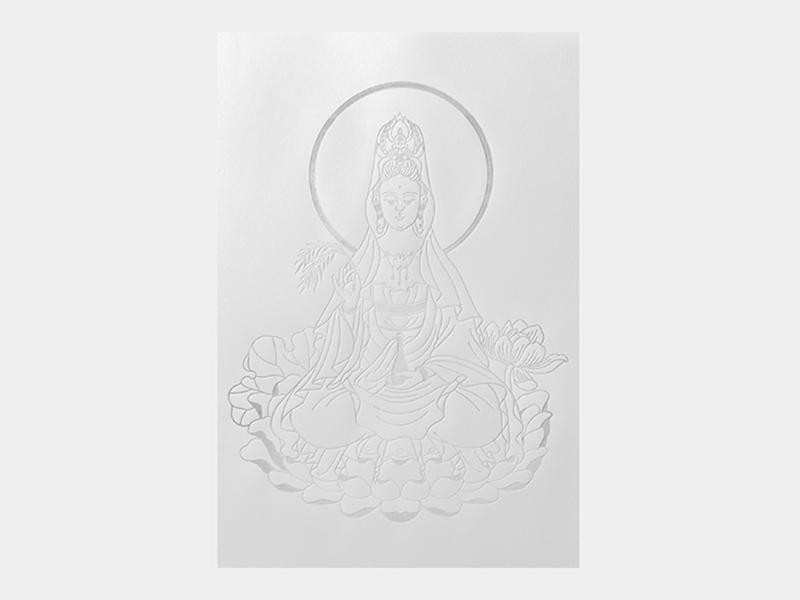 燙透紙加工過後會剩下中間透光的膜,覺得這樣的氣質很適合觀世音菩薩呈現。就像是菩薩發光的樣子,低調且高雅。