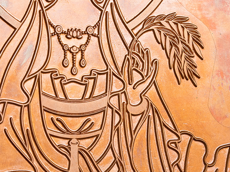 - パチカの加熱型押し後に残った薄い膜になった部分が光を透過する様が、観世音菩薩が現れて慎み深く高尚に光り輝いている様子にとてもあっていてるように感じ、選びました。(田修銓さん)
