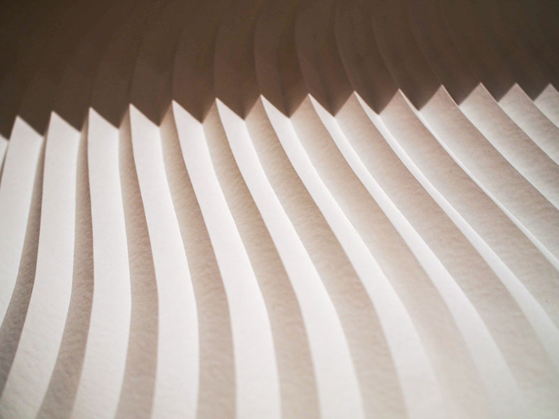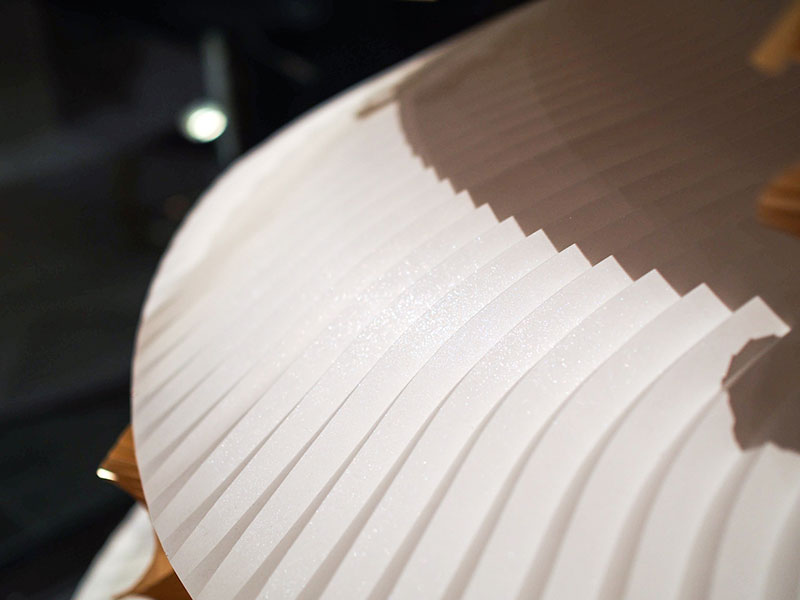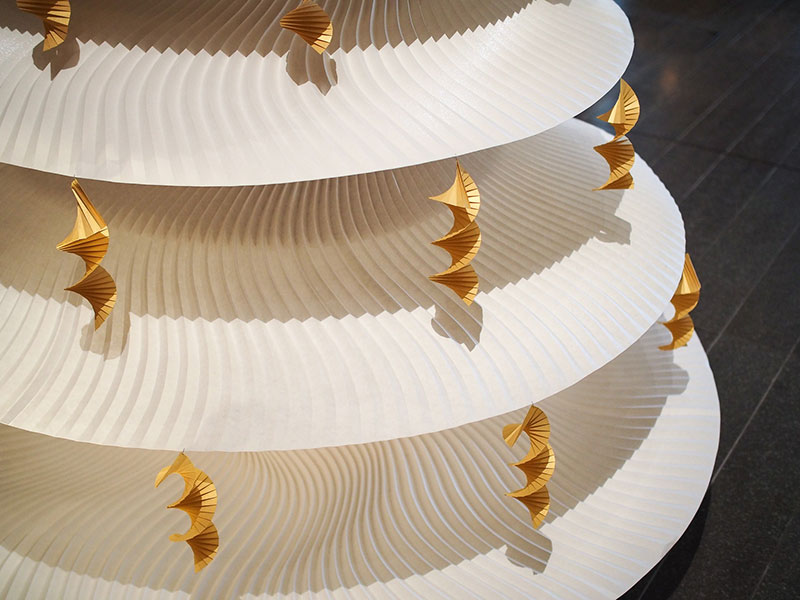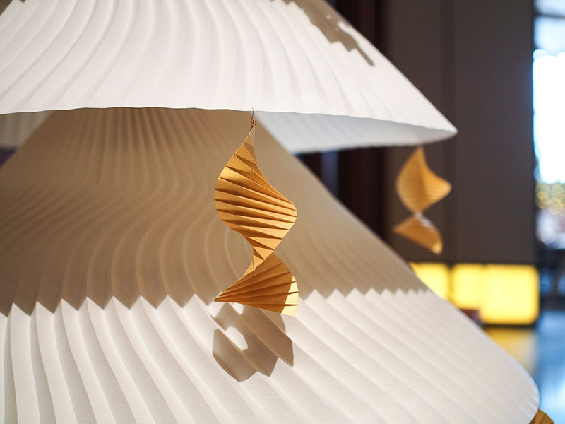 - アンダーズ 東京のデザイナーであるトニー・チーが掲げた「Memory-”折り紙”のように折り重なっていく記憶」というコンセプトにインスピレーションを得て「折り紙」をテーマとし、「折りひだ」で記憶の重なりを表現するとともに陰影を生み出しつつ、クリスマスという神聖な日を祝す木を模した造形に表現しました。今回は、クリスマスということで「雪」をテーマに雪に関する銘柄を選び製作し、紙の開発者の雪への思いを一層一層変化を加えて表現しました。(西村優子さん)