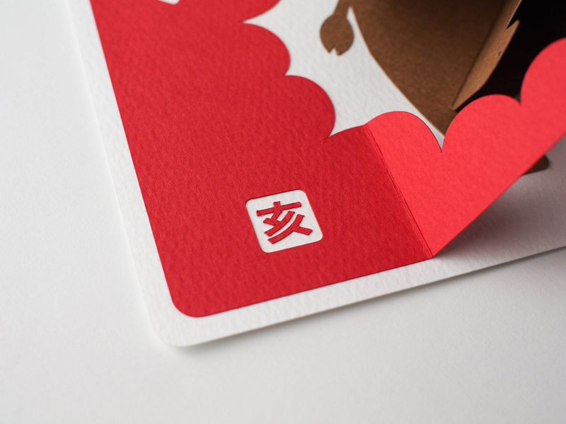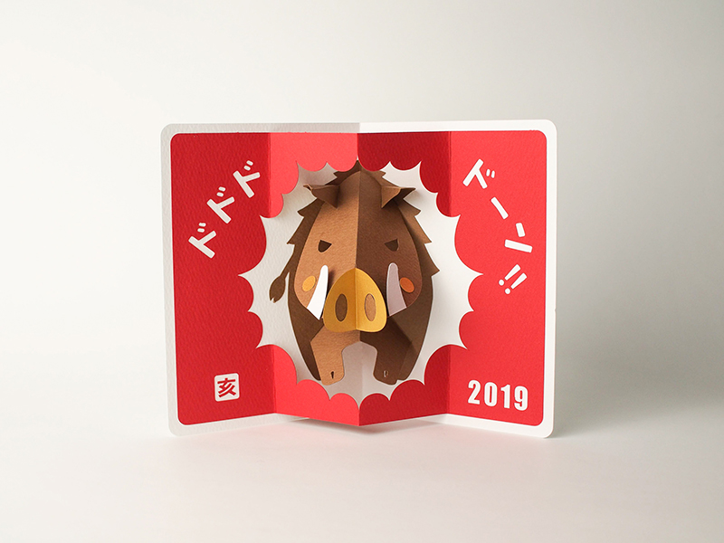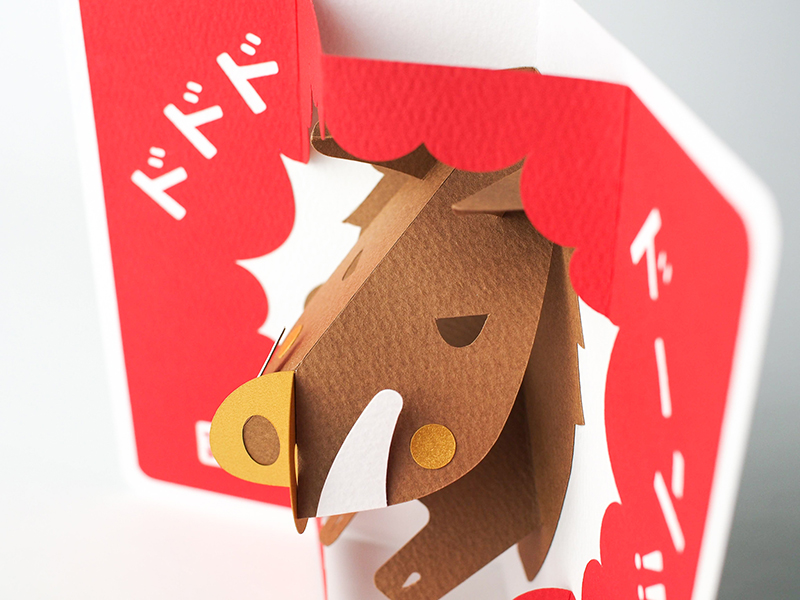 - 今年の干支であるイノシシの猪突猛進をそのままデザインにしました。勢いよくイノシシが飛び出すイメージとカタカナの文字でポップ感も出しています。ポップアップカードに使用するにはちょうどよい厚みで、 紙の質感も可愛く、イノシシとの相性もバッチリです。(株式会社ソロルファクトリー 山本ちさとさん)